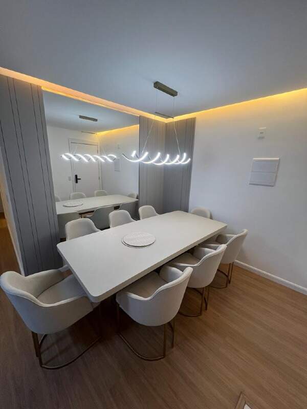 - 1 sala para dois ambientes, com piso em laminado e ar condicionado;