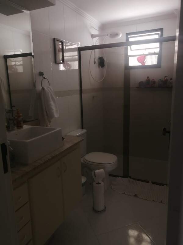 - Banheiro social com box de vidro e gabinete;