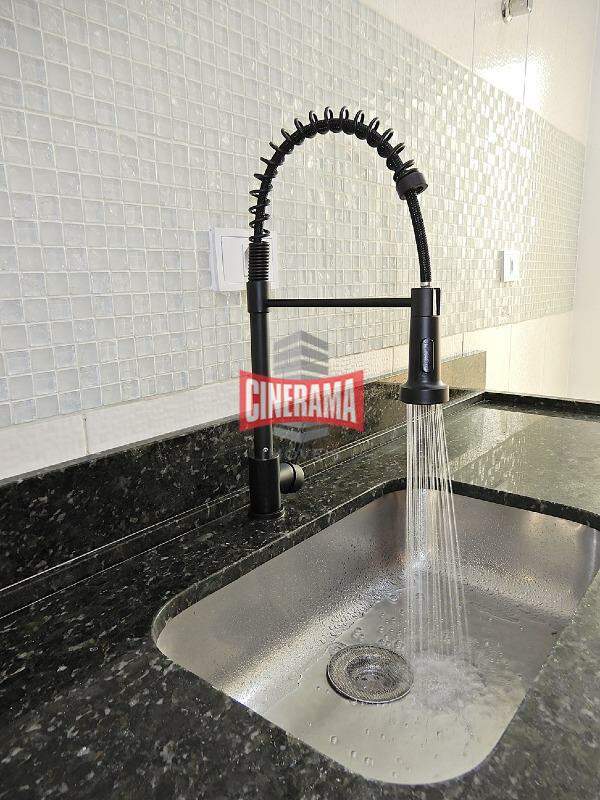 - Cozinha Americana com design moderno, pia em granito preto e torneira Gourmet com misturador;