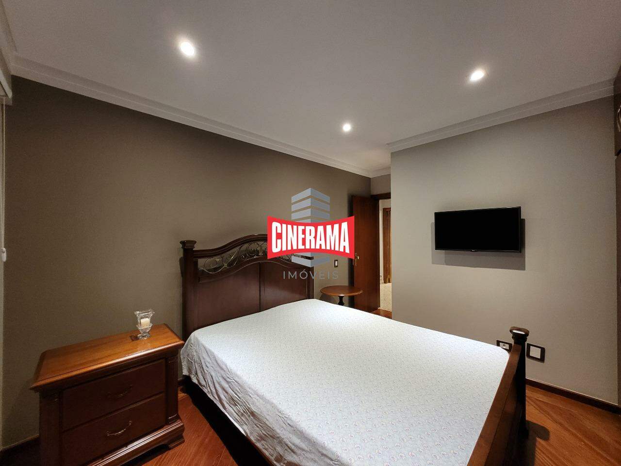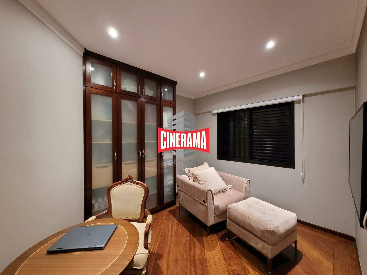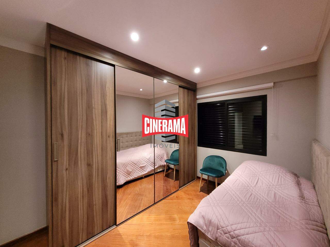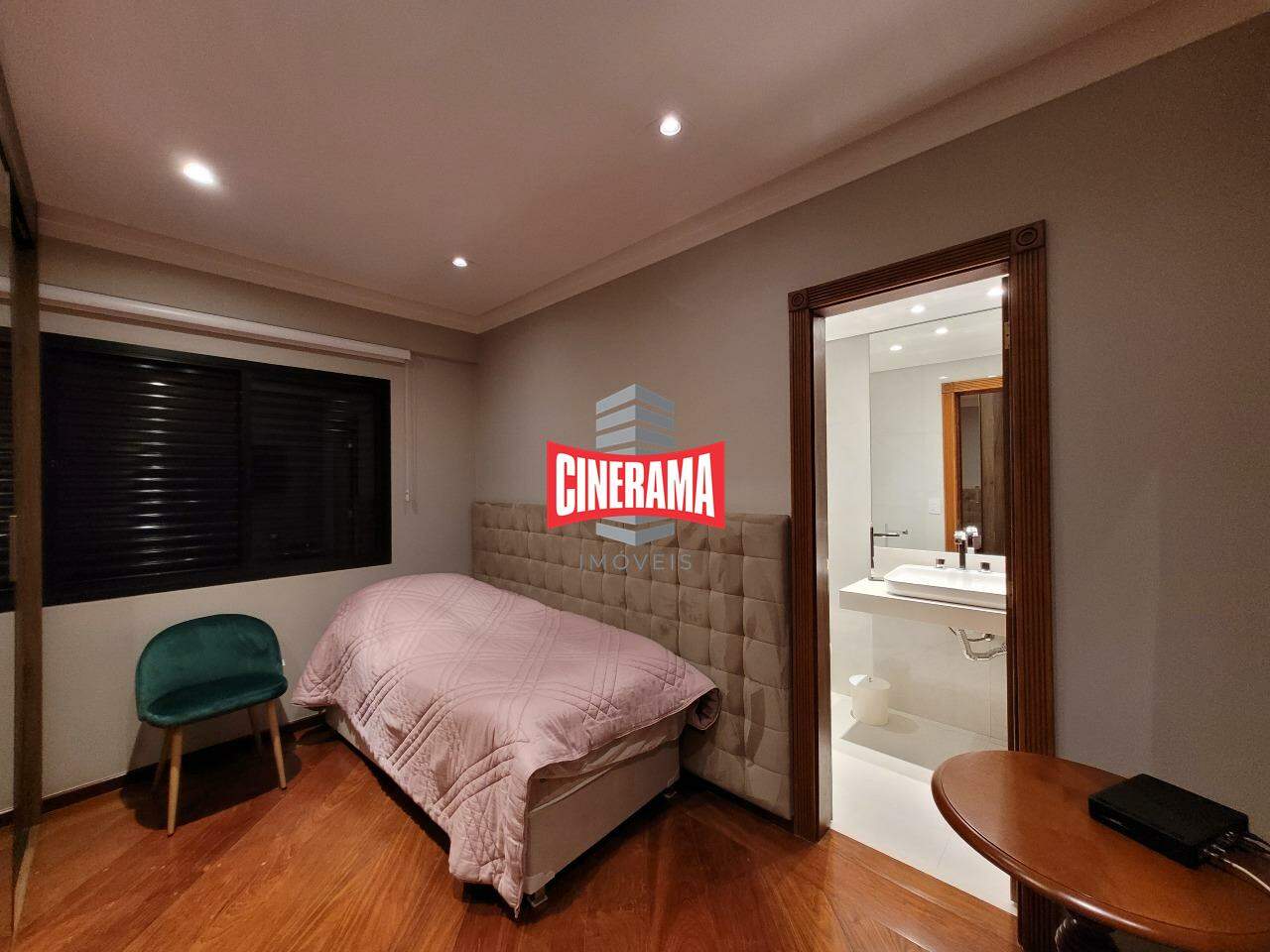 Dormitório com piso em madeira, piso da cozinha em granito.