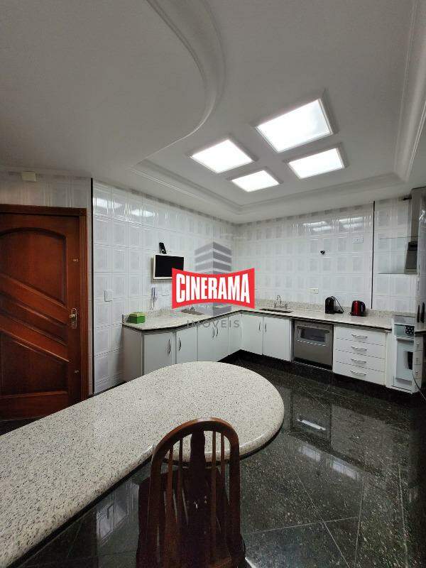 - Cozinha com armários planejados, fogão, coifa e mesa;