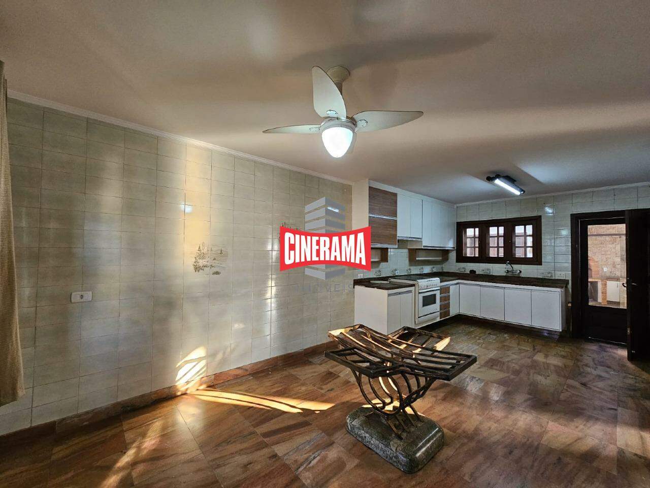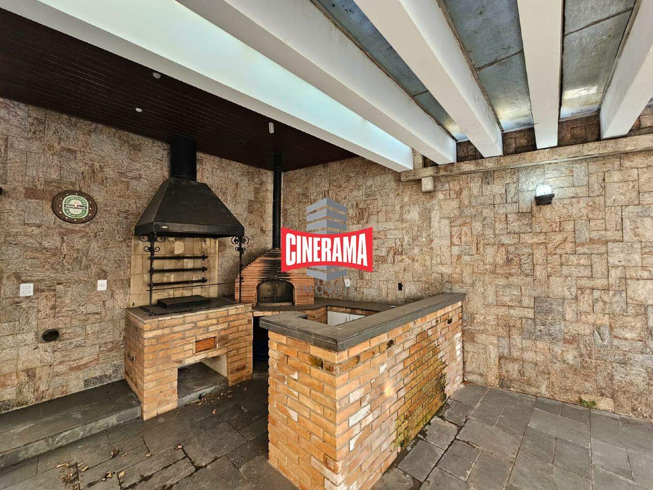 Edícula com churrasqueira integrada à cozinha.